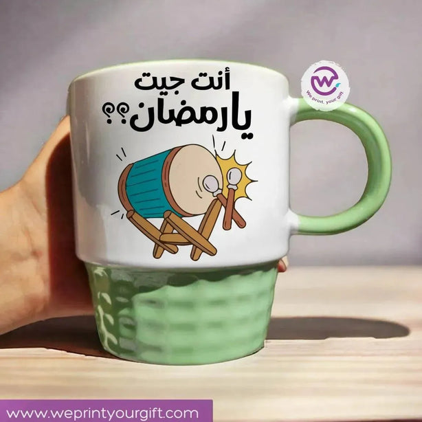 المنتج الموصوف هو كوب مخطط ملون من شركة WE PRINT, YOUR GIFT. يحتوي هذا الكوب على عدة ميزات مميزة: